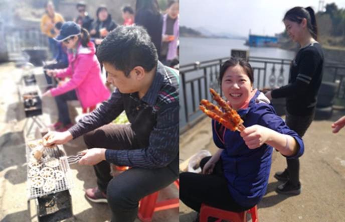 一个多小时的徒步之后,在美丽的湖岸边进行自助烧烤。大家支设烧烤架、生火、穿串、烤串,即分工又合作,一阵紧张的忙碌,荤素搭配、色香味全的烤串让大家大饱口福、津津有味。